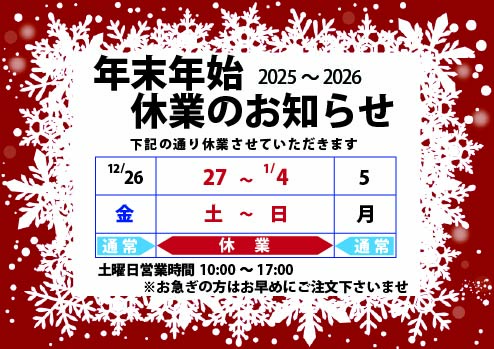 2025 年 12 月 24 日 – AM 11:40 年末年始 休業のお知らせ 2025年12月27日(土)~2026年1月4日(日)迄お休みいただきます オンラインショップからご注文承ります 商品の発送・引き渡し、校正などは2026年1月5日(月)以降となります ご了承くださいませ 2026年もよろしくお願いいたします
